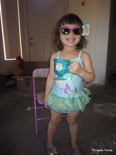 She loves her new swimwear! The flip flops are size 9/10 which is a little big big on her feet. I decided to get her the bigger size because there's not a lot of room to grow for size 7/8. She grows so fast, so I think within the next 3 months, the flip flops won't look as awkward as they are right now. Her swimsuit is size 2/3 which is the perfect fit for her size and age. The front is embellished with Tinker Bell and butterflies screen art and sequins. The embellishment makes it look fancy. She loves the four-layered skirt tutu, too! It made her say "I'm a princess!" while trying to sway her hips to show off her outfit. The sunglasses' lenses are a little bit small, but looks perfect on her as well as the fit. It's actually smaller than the DS Princess sunglasses. All in all, I love everything I got for her for summer water play!